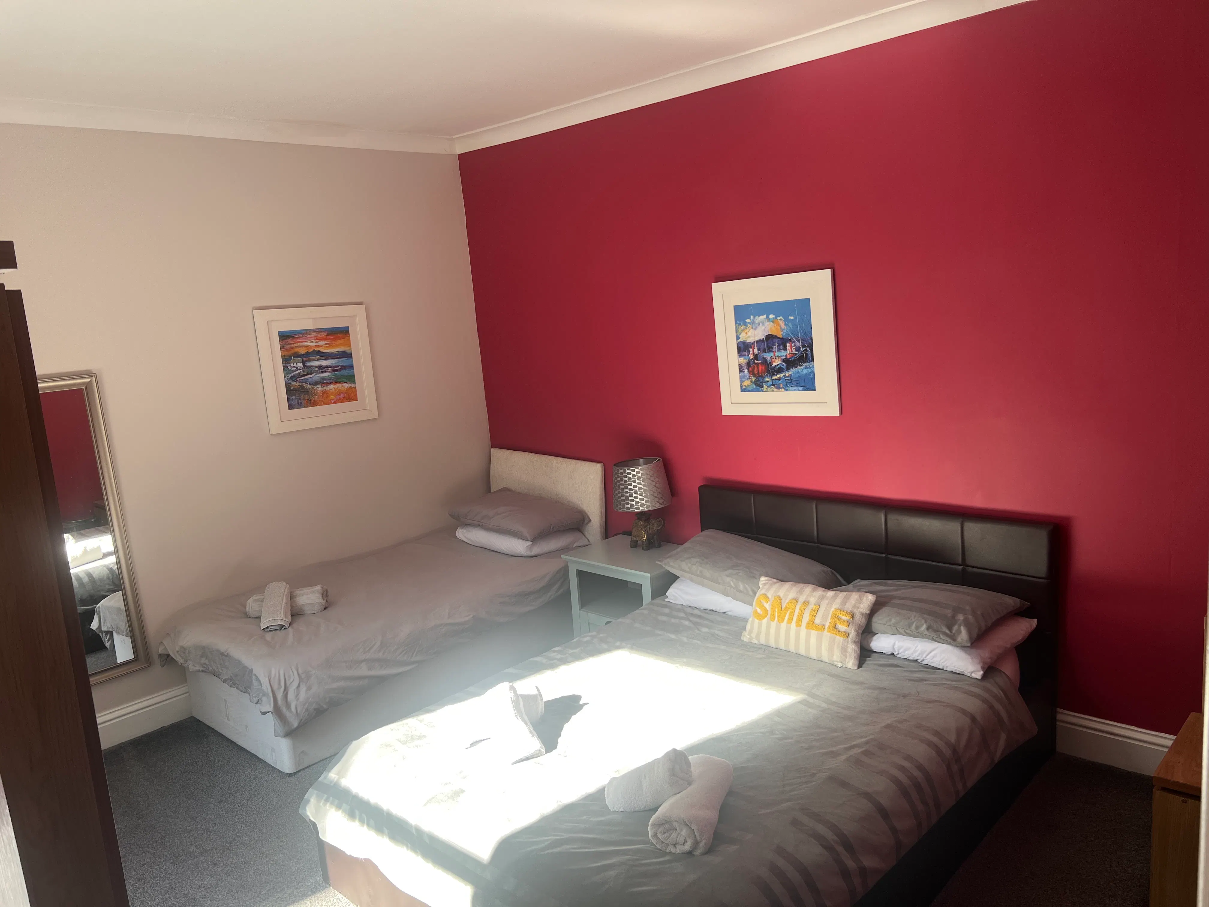 This room has one double and one single bed, tea and coffee making facilities, a private bathroom with shower and hairdryer, and a view to the rear of the property.